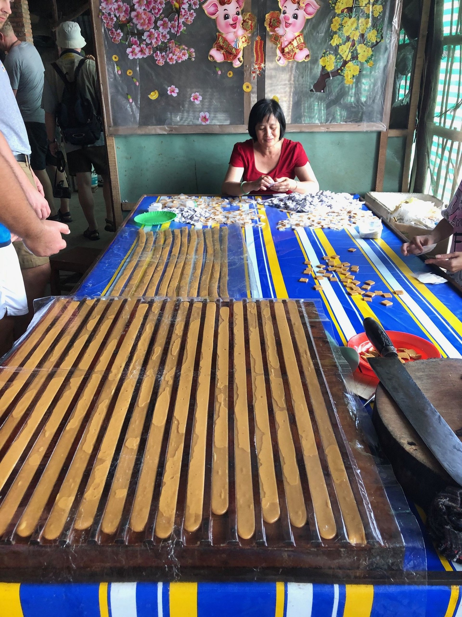 Anschließend ziehen die Spaziergänger mit ihrem Guide los und wir übernehmen Fahrräder und erkunden die Gegend. Wir fahren durch kleine Gassen, überqueren schmale Brücken, bleiben beim Kindergarten stehen und halten bei Handwerkern an, die aus den Wasserhyazinthen Taschen, Hüte und Körbe flechten. Auf einer kleinen Farm werden Pilze gezüchtet und außerdem verschiedeneste Produkte aus Honig hergestellt. Natürlich kosten wir alles von schwarzem Knoblauch über lokale Schokolade bis Hibiskustee. Nach der Fahrradtour geht es mit dem Ausflugsboot noch durch den Markt von Cai Be und zu einem Handwerksbetrieb. Hier stellen Sie Reispapier, köstlich klebrige Kokosbonbons und Popcorn aus Reis her. Wir schlagen wieder einmal zu und ignorieren die übrigen Souvenirs von Schlangenschnaps bis Krokodilledertaschen.
