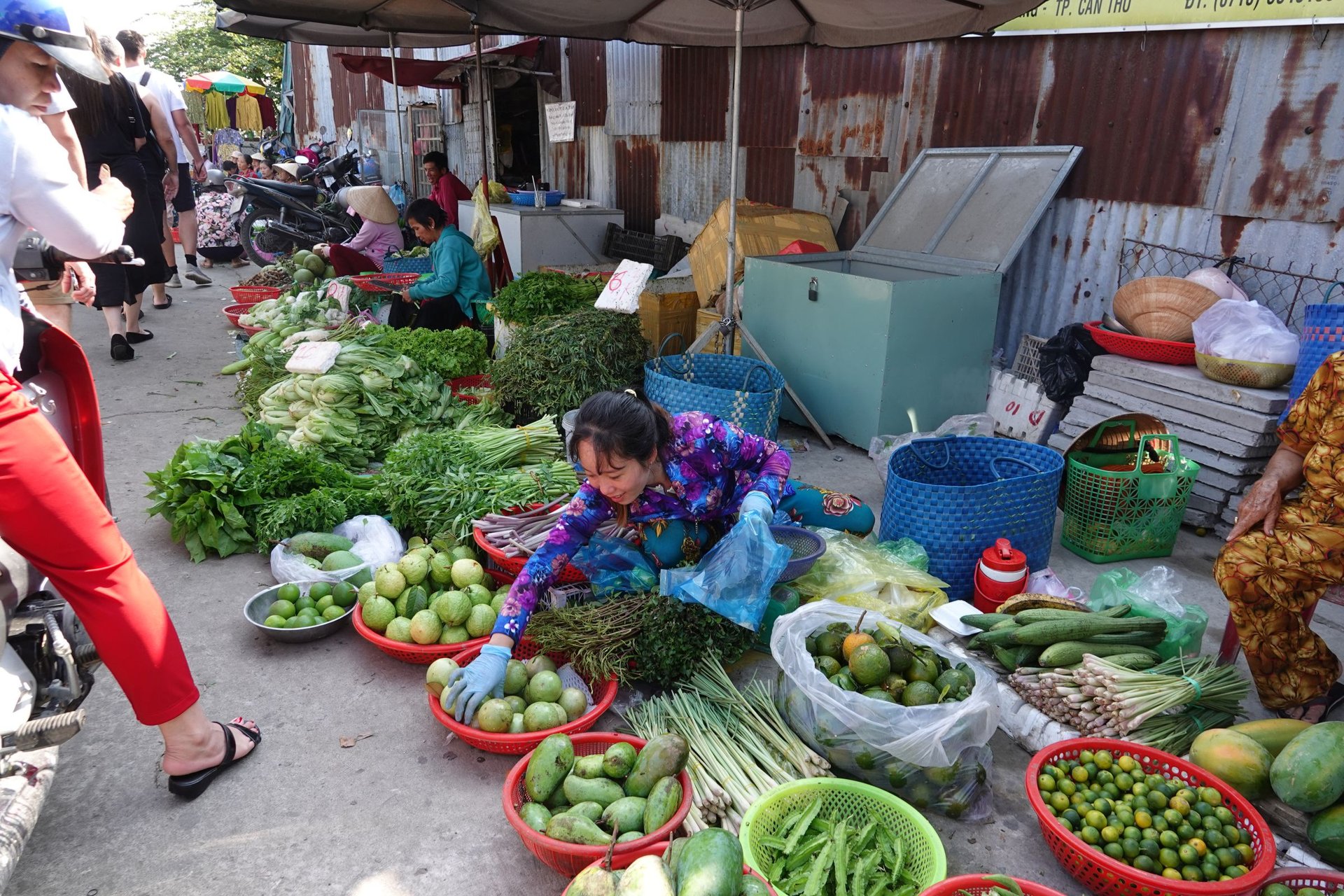 Erster Programmpunkt ist der Besuch des schwimmenden Marktes von Cai Rang. Das ist der lokale saisonale Markt für Großhändler und die Boote sind jetzt schwer beladen mit Melonen, Kartoffeln oder Pomelos. Es ist kein Markt für Touristen und die Preise beginnen erst bei einer Abnahme von mindestens 10 kg. Wir brauchen also nicht handeln, sondern hören zu wie der Alltag der Händler hier abläuft.