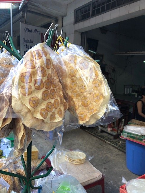 Sie leben mit ihren Familien an Bord und nützen die fahrenden Supermärkte und Boote mit Snacks, die auch an unserem Ausflugssampan anlegen. Dann geht es zu Fuss auf den lokalen Markt. Neben frischem Obst und Gemüse gibt es wirklich alle Sorten von Fisch und Fleisch. Ich habe höchsten Respekt vor meinem älteren Sohn, der tatsächlich getrockneten Frosch versucht. Er ist nicht wirklich davon begeistert und wir probieren uns lieber durch das reíchliche Angebot von Snacks mit Bananen, über offenem Feuer gebackenen Kuchen und Eis aus Bohnen. Mein Mann findet schließlich an einem Haushaltsstand noch ein paar hübsche Töpfe für seine Bonsais als Souvenir. Ausführlich Zeit nehmen wir uns auch in einer Reisnudelproduktion mitten im Markt. Wir sehen wie zunächst das Reispapier gebacken und getrocknet wird und dann daraus die Nudeln geschnitten werden. Es ist wirklich immer noch unglaublich viel Handarbeit in den lokalen Lebensmitteln!