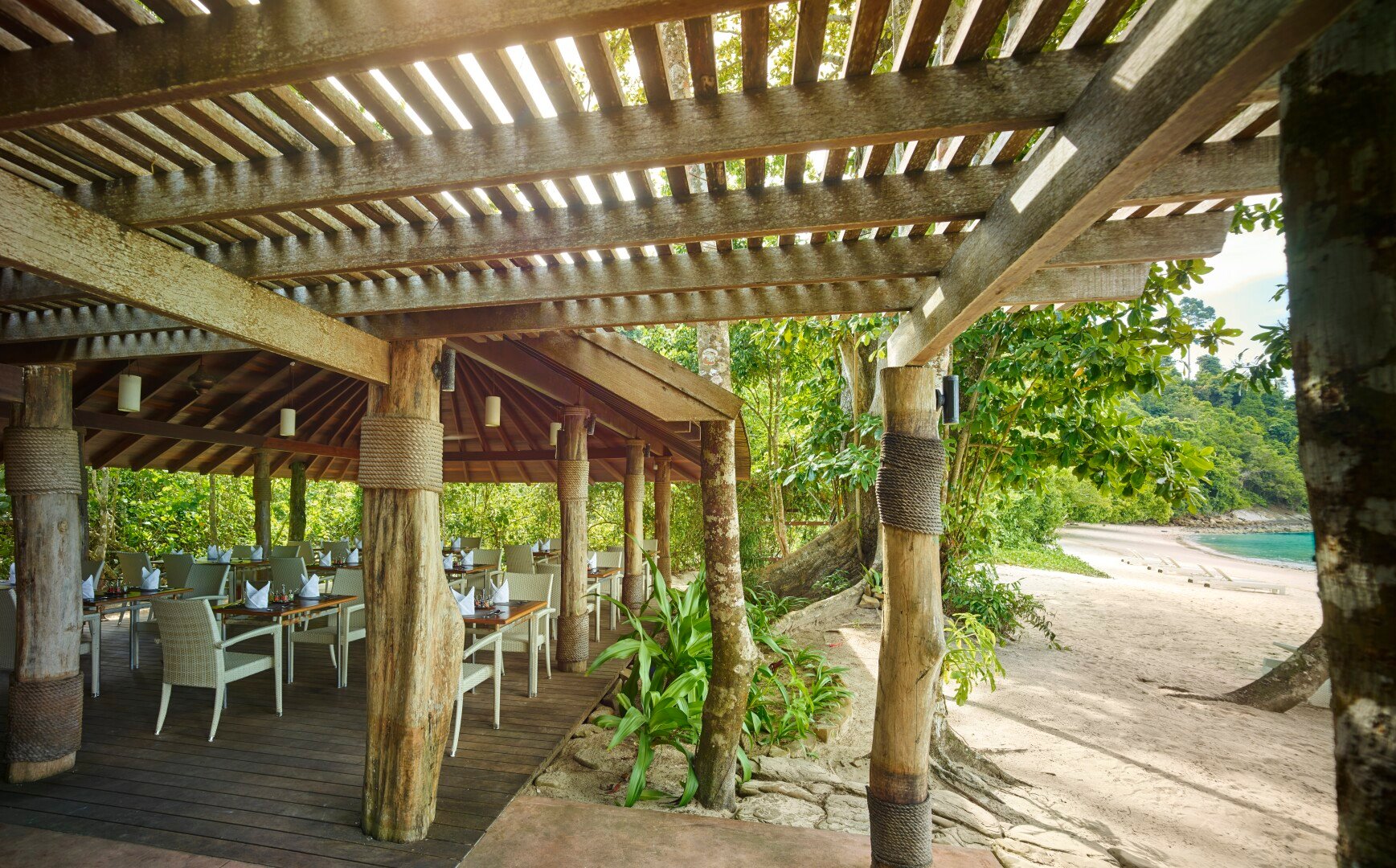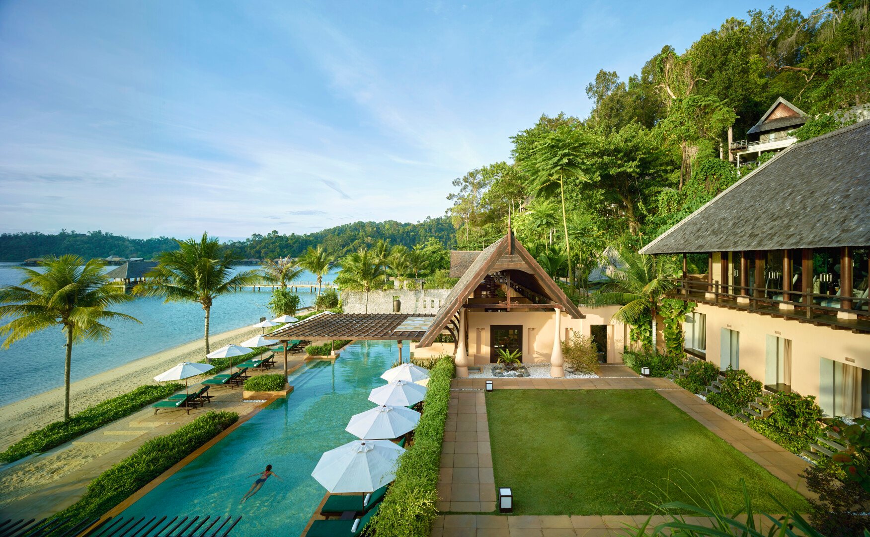Der Einrichtungsstil der Villen ist modern und elegant, trotzdem ökologisch mit Elementen der Region Sabah. Erholungssuchende und aktive Familien finden hier ausreichend Möglichkeiten, um ihren Urlaub zu verbringen. Nachhaltigkeit und Naturverbundenheit sind wichtig, es gibt nur wenige motorisierte Fahrzeuge auf der Insel und das Hotel bietet geführte Wanderungen an. Ein eigenes Marinezentrum widmet sich dem Erhalt der Korallenriffe und das Schildkrötenzentrum der Rettung dieser gefährdeten Tierart.