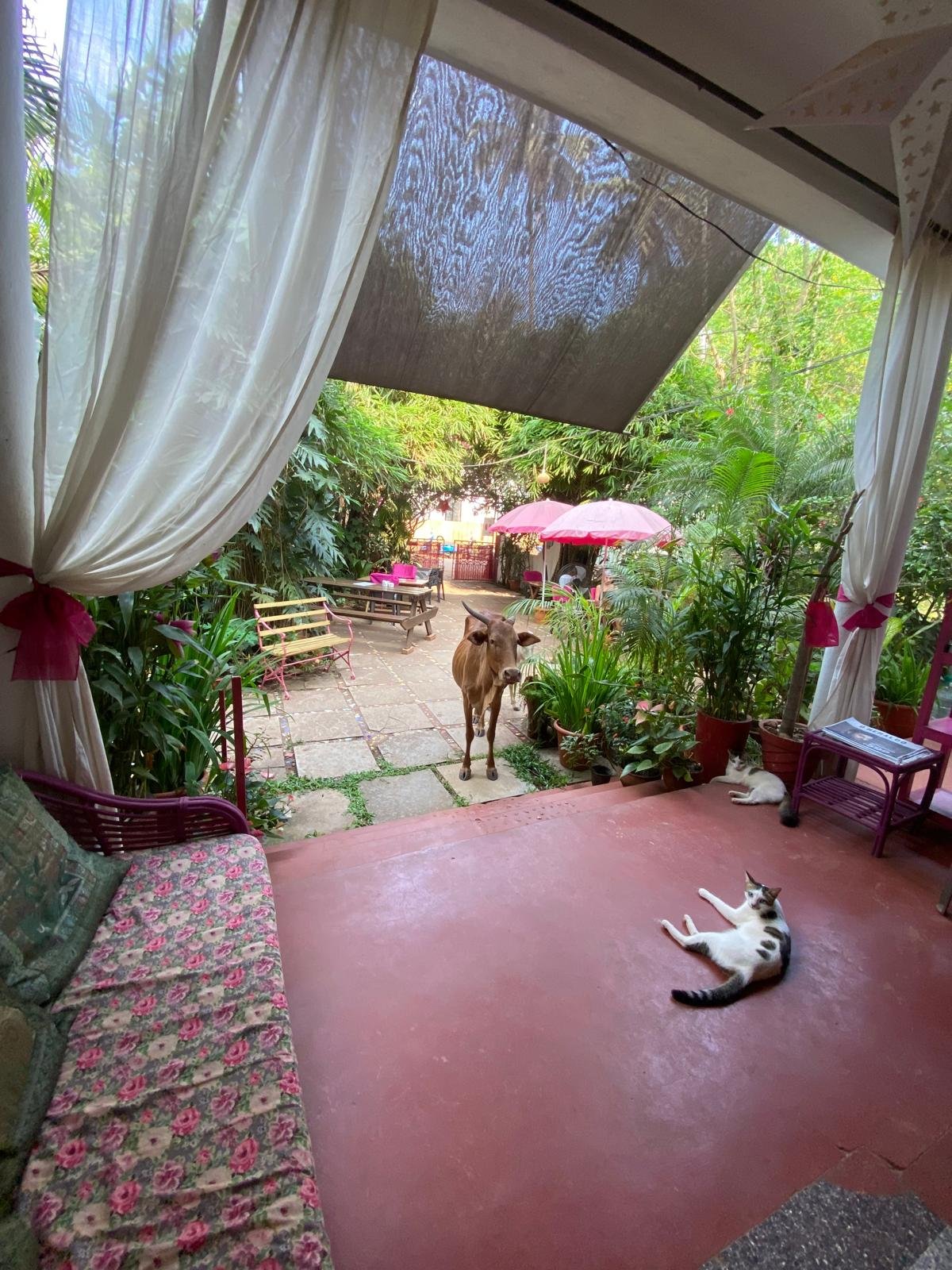 Unser Ziel, der legendäre Hippieort Anjuna, liegt genau zwischen den beiden Airports. Wir kommen am späteren Abend an und übernachten in einer Pension einer ausgewanderten Französin im Ort. Sie teilt ihr Haus mit einigen Katzen und beim Frühstück spaziert ganz selbstverständlich eine Kuh mit Kälbchen an unserem Tisch im Vorgarten vorbei. Willkommen in Indien!