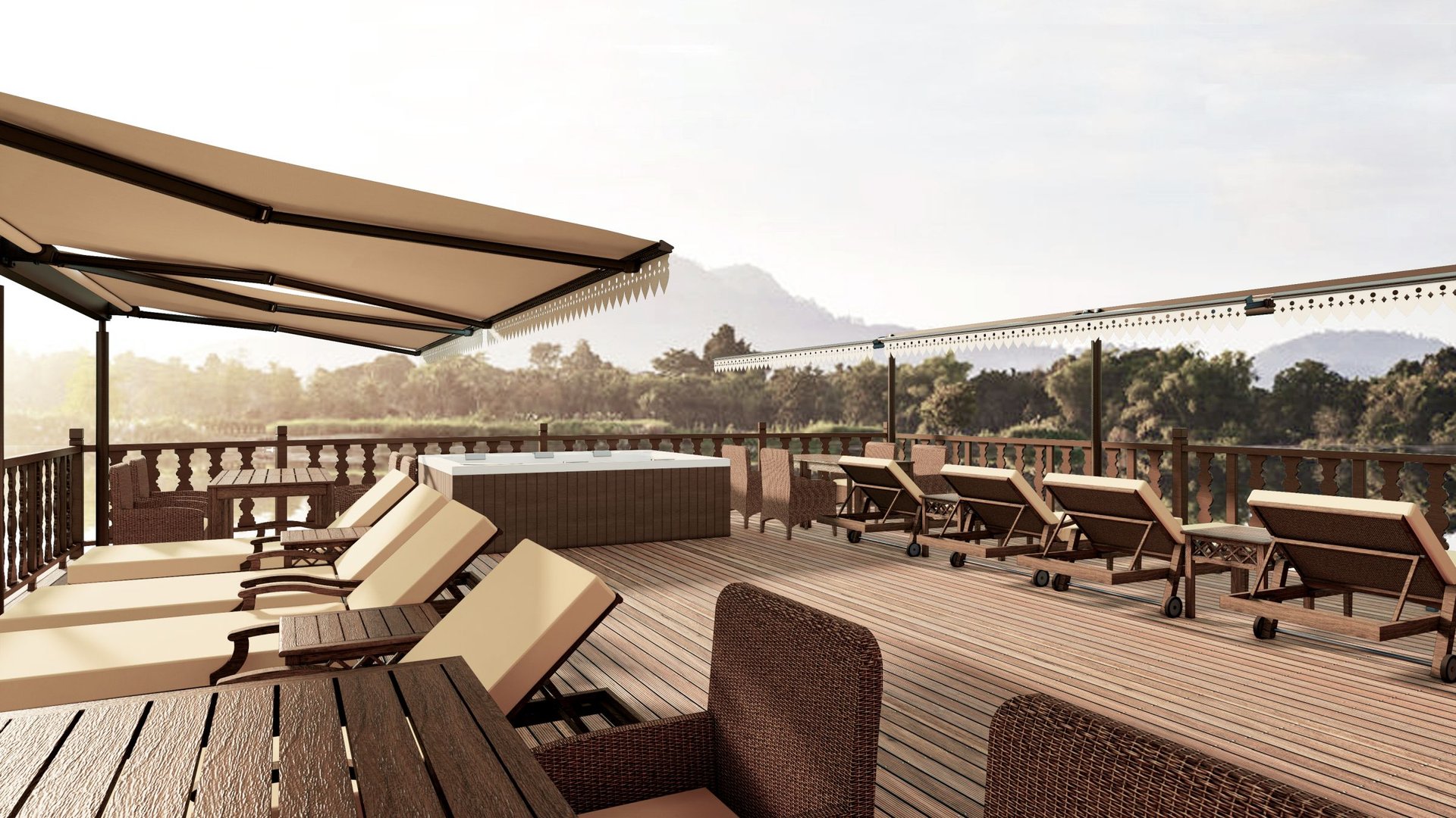 Das Boutiqueschiff mit zehn exquisit ausgestatteten Kabinen und Suiten verspricht unvergleichlichen Komfort mit großzügigen Wohnräumen und anspruchsvollem Design, während die maximal 20 Gäste eine Reise durch einige der atemberaubendsten und abgelegensten Gebiete von Laos antreten. Das kürzlich umgestaltete Oberdeck bietet eine neue Aufteilung, bei der das Sonnendeck und die Bar-Lounge nach hinten verlegt wurden, um in der Mitte große Deluxe Executive-Kabinen unterzubringen. Diese Kabinen sind mit Doppelbetten ausgestattet, die so positioniert sind, dass sie zu den Panoramafenstern ausgerichtet sind, was den Komfort und die Privatsphäre erhöht. Die Anouvong ist das erste Schiff auf dem oberen Mekong, das einen kleinen Jacuzzi-Pool bietet, in dem sich die Gäste an sonnigen, heißen Tagen entspannen und abkühlen können. Darüber hinaus verfügt die Anouvong über einen kleinen Fitnessraum auf dem Oberdeck, von dem aus man einen herrlichen Blick auf die malerische Küste hat.