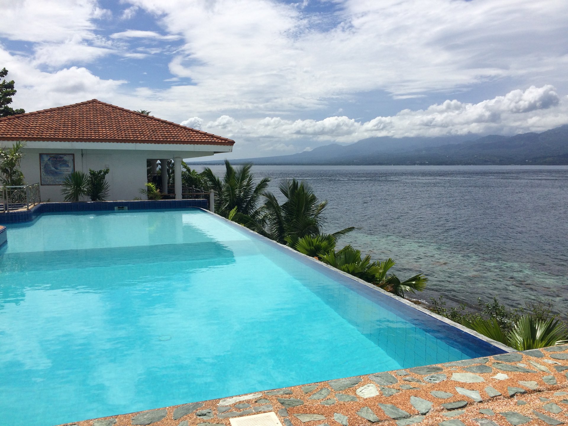Unser Ziel ist ein kleines Hotel fast an der Südspitze der Insel, wo wir schließlich gegen Abend ankommen. Ein kleiner Pool erwartet uns und wir sind begeistert vom köstlichen Fisch, der als Tagesgericht angeboten wird. Wir organisieren mit der Besitzerin noch die Abholung frühmorgens zu unserer Tour zu den Walhaien und genießen dann den Ausblick aufs Meer von unserem Balkon.