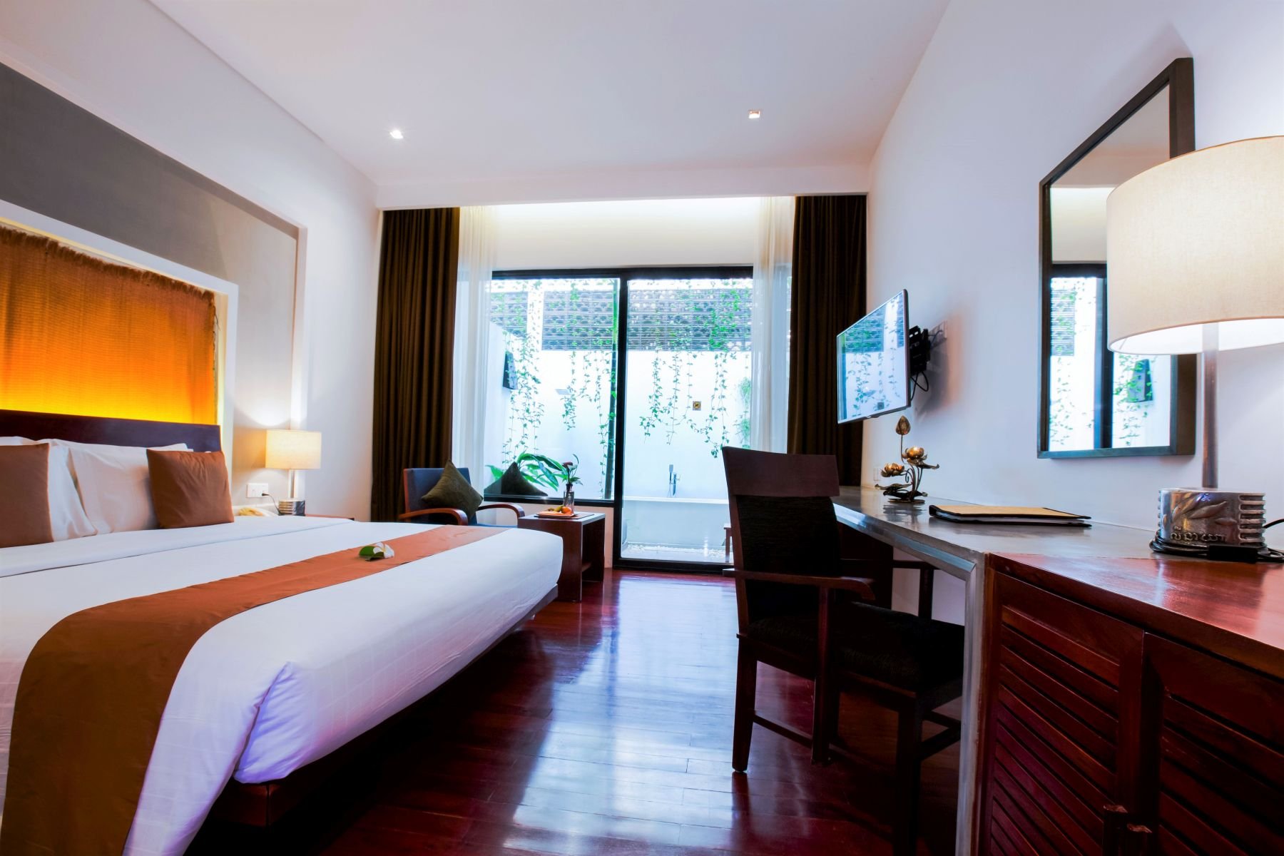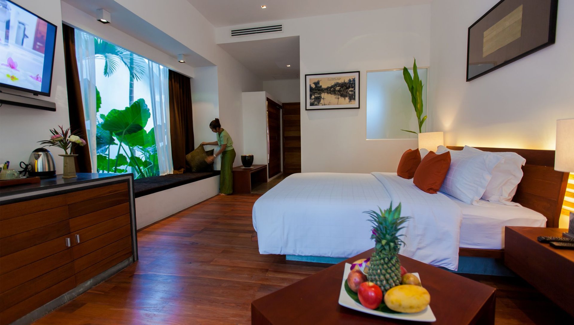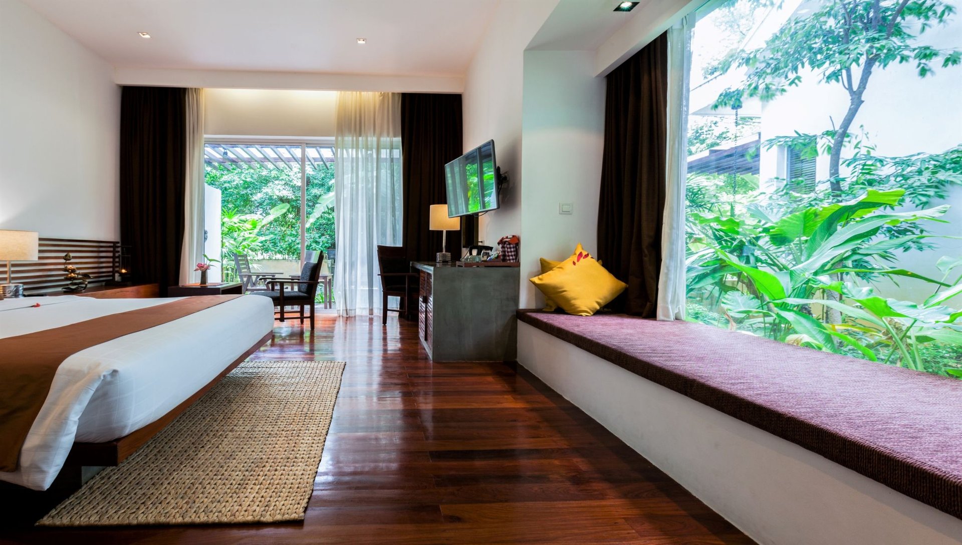 Die Zimmerauswahl reicht von Superior Rooms über Bungalows bis zu verschiedenen Suiten. Ausgestatt sind alle im Khmer Stil und verfügen über ein hochwertiges King Size Bett, eigenes Badezimmer, Safe, Flachbild TV und Schreibtisch. Damit Sie sich wie zu Hause fühlen warten in den Zimmern Bademantel, Hausschuhe, Haartrockner, kostenloses Highspeed-Wifi und Kaffee- und Teezubereiter. Der Pool lädt zur Erfrischung nach einem Besichtigungstag, im Spa können Sie sich mit einer Wellnessanwendung verwöhnen lassen und im Restaurant die lokalen Spezialitäten genießen.