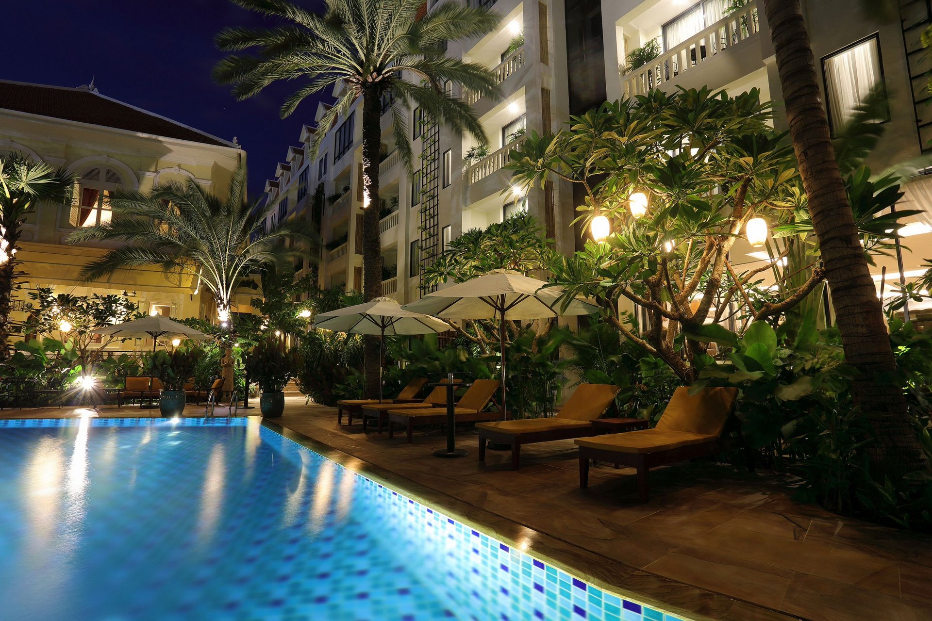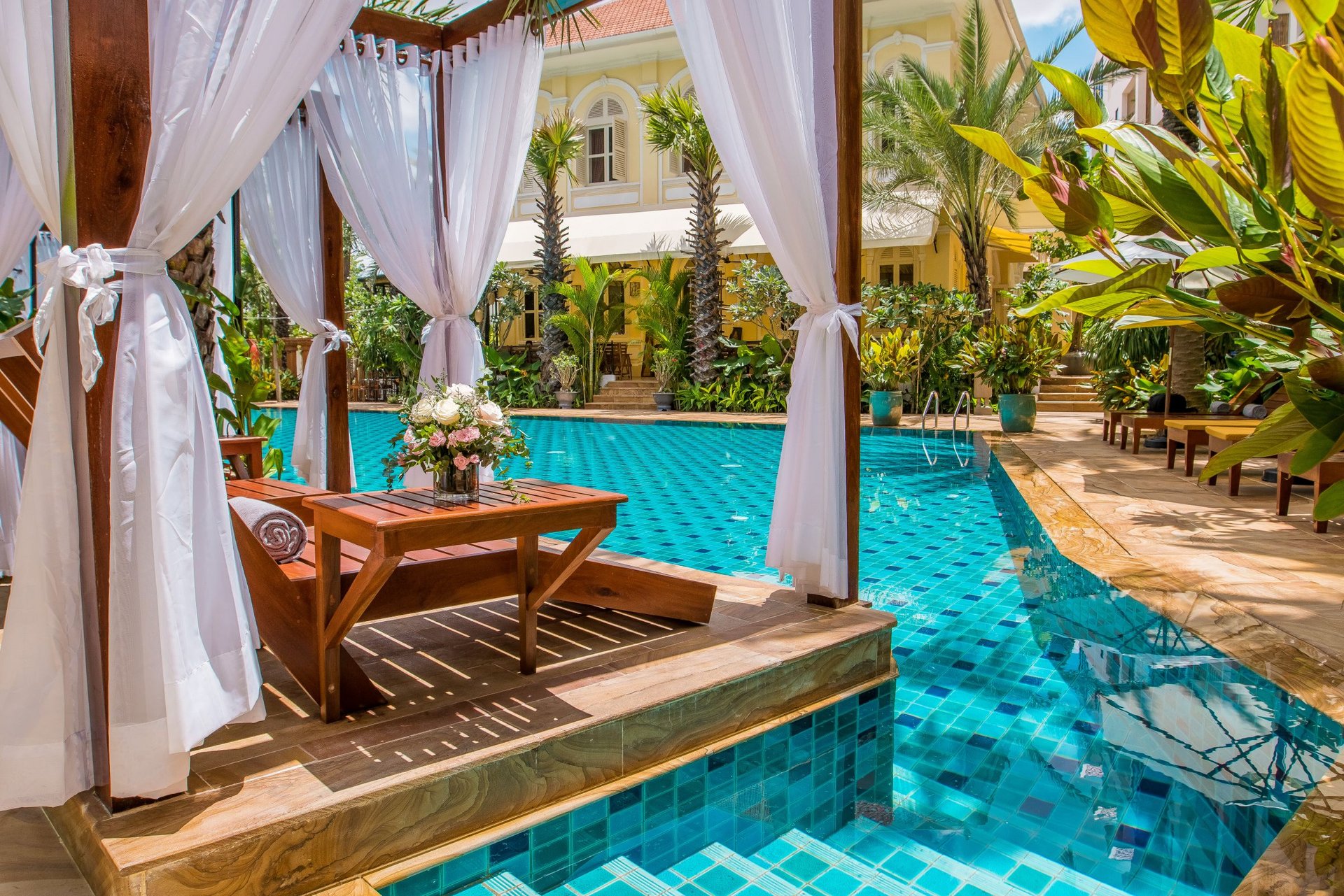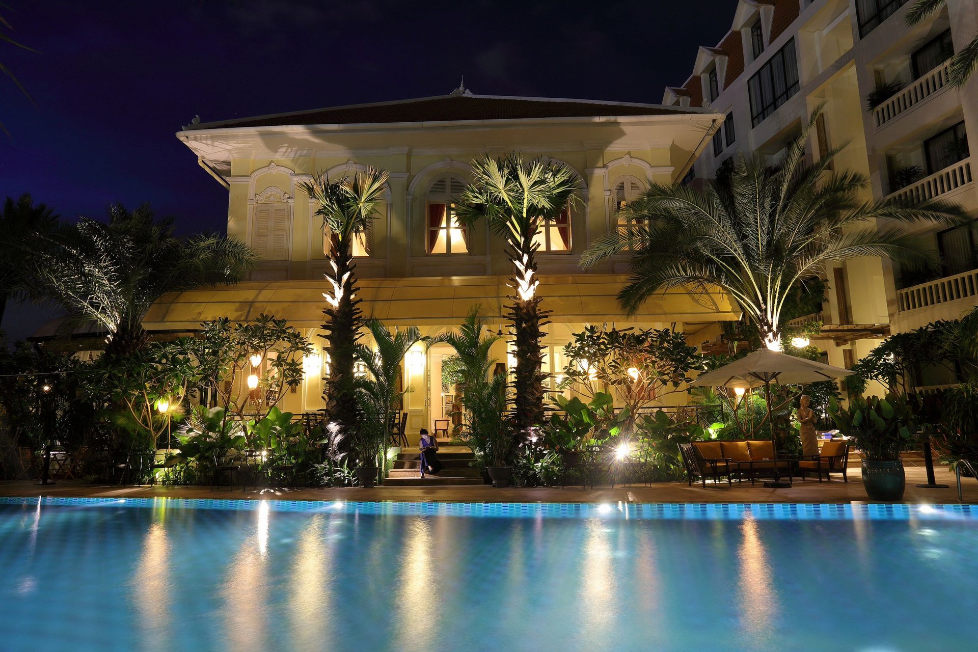 Den Mittelpunkt des Palace Gate Hotels bildet ein französisches Kolonialgebäude, das einst als Hauptquartier für den Befehlshaber der französischen Armee diente und heute das ausgezeichnete Restaurant beherbergt. Von der Dachterrasse schweift der Blick über den Zusammenfluss von Tonle Sap und Mekong und hier befindet sich auch der hoteleigene Biogarten, wo Kräuter und Gemüse angebaut wird. Wenn Sie am Thron vorbeikommen - der steht nicht nur zur Dekoration hier - wenn die Königinmutter zum Essen vorbeikommt wird er auch benutzt!