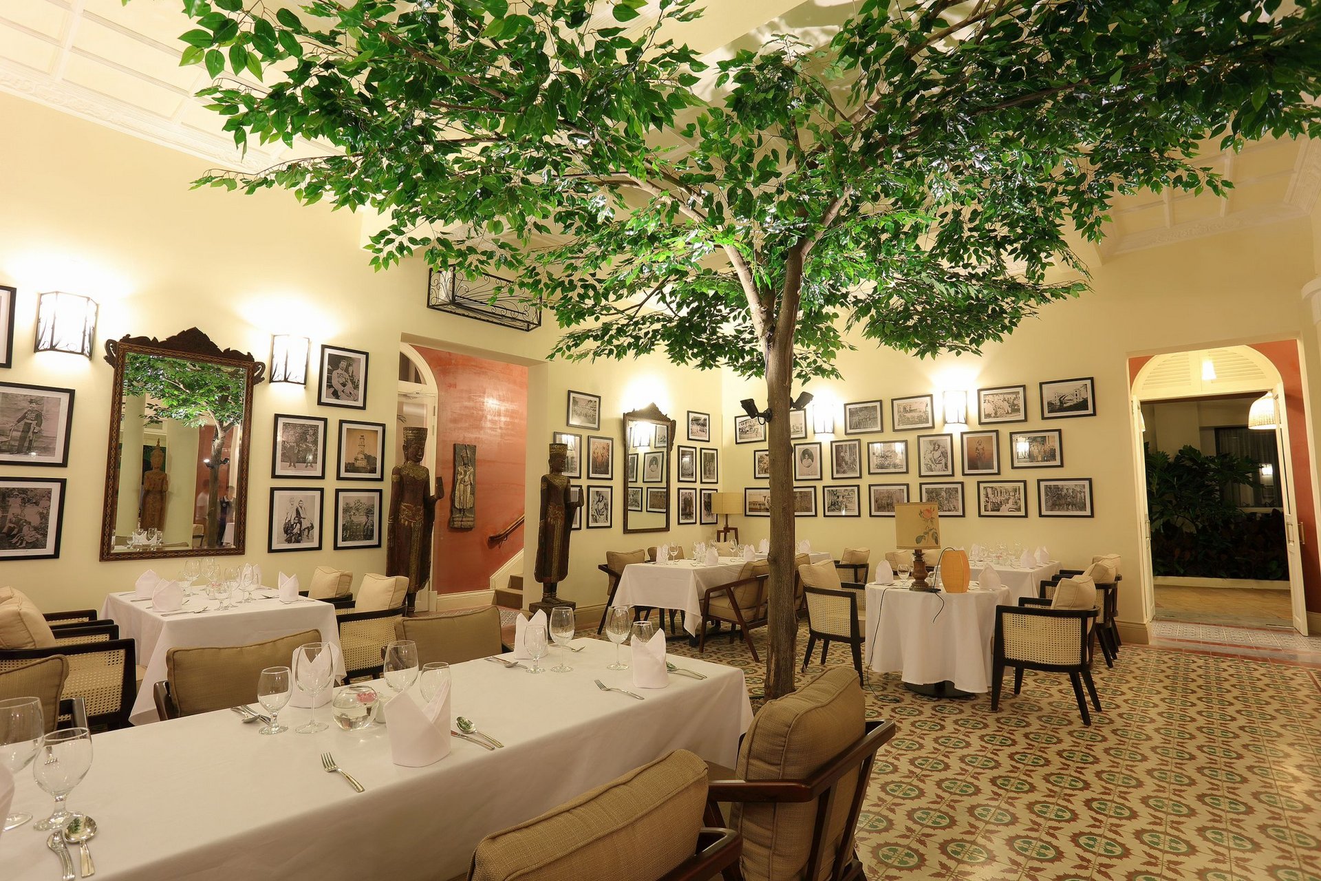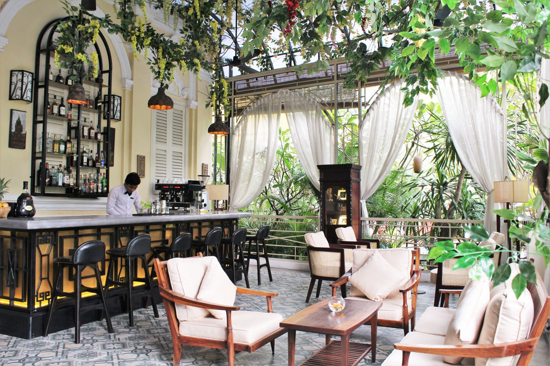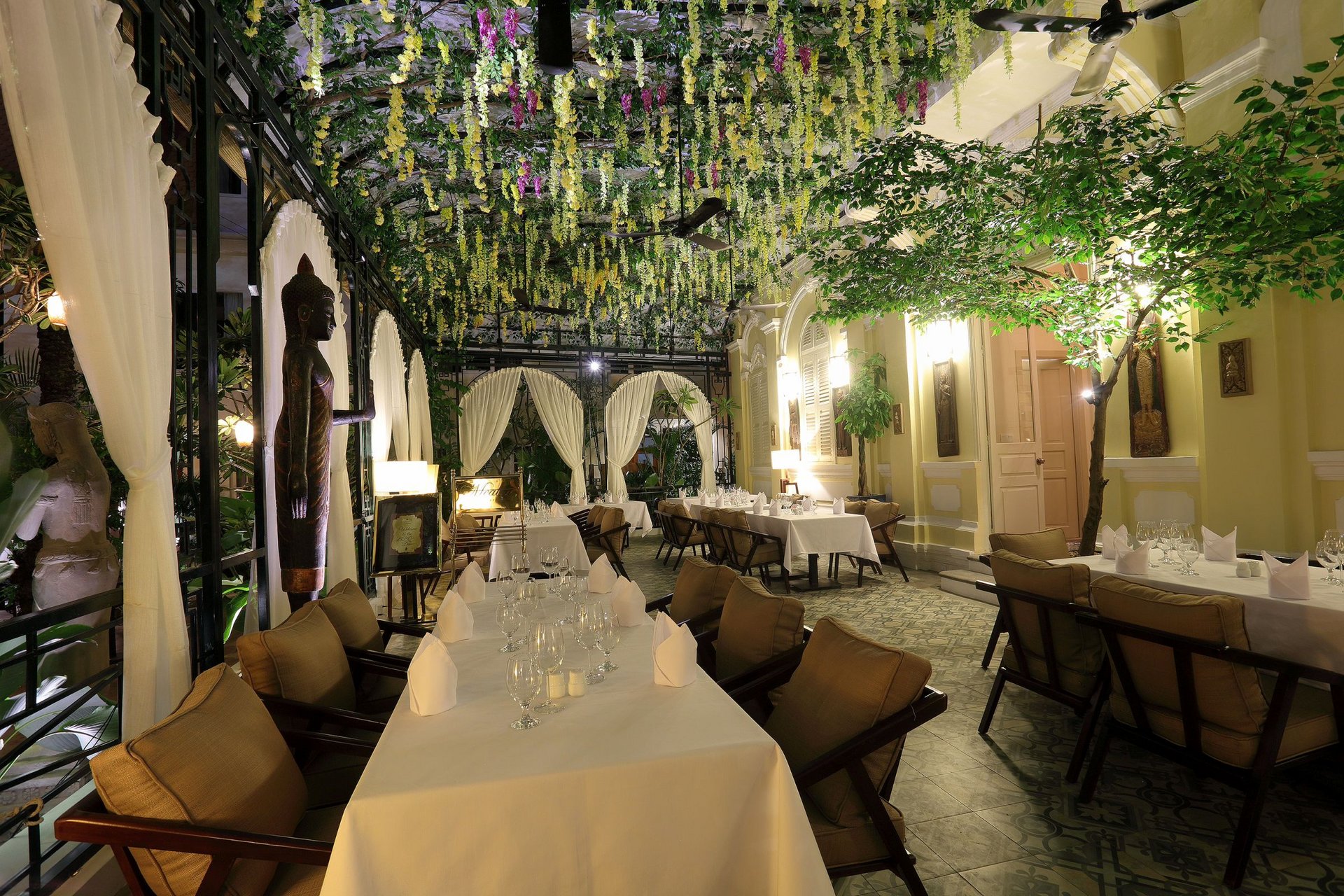 Den Mittelpunkt des Palace Gate Hotels bildet ein französisches Kolonialgebäude, das einst als Hauptquartier für den Befehlshaber der französischen Armee diente und heute das ausgezeichnete Restaurant beherbergt. Von der Dachterrasse schweift der Blick über den Zusammenfluss von Tonle Sap und Mekong und hier befindet sich auch der hoteleigene Biogarten, wo Kräuter und Gemüse angebaut wird. Wenn Sie am Thron vorbeikommen - der steht nicht nur zur Dekoration hier - wenn die Königinmutter zum Essen vorbeikommt wird er auch benutzt!