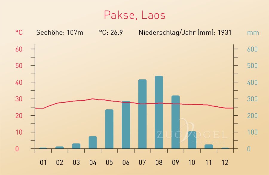 Pakse ist die drittgrößte Stadt in Laos und außerdem Hauptstadt der Champasak-Provinz. Sie befindet sich im Süden des Landes und ist der zentrale Transport- und Knotenpunkt der Gegend. Neben Tempeln wie Wat Luang und Wat Tham Fai ist das nahegelegene Bolaven-Plateau mit seinen eindrucksvollen Wasserfällen und atemberaubenden Landschaft die Hauptattraktion. Dort befindet sich außerdem das Hauptanbaugebiet des laotischen Kaffees. Während der Trockenzeit ist hier mit Temperaturen von 20-30°C und kaum Niederschlägen zu rechnen.