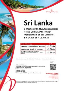 Sri Lanka verfügt über eine Vielzahl an Hotels. Für den Zeitraum November bis April eignen sich Hotels an der West-/ Südwestküste. Aktuelle Angebote zur Orientierung für jeweils 4 - 6 Nächte in sehr gut bewerteten Hotels direkt am Strand finden Sie hier!