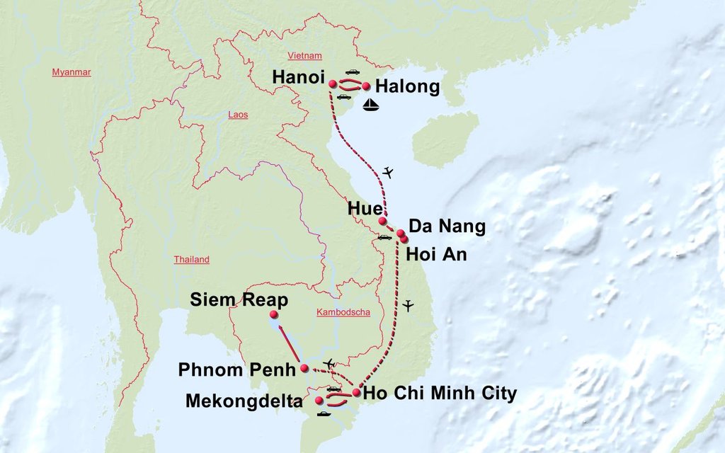 Stationen der Route: Hanoi Halong Bucht Hue Hoi An Ho Chi Minh City Siem Reap Tonle Sap