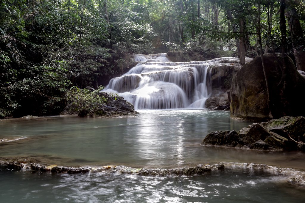 Bevor es in den Erawan Nationalpark geht, gilt der erste Halt am Morgen dem Besuch einer imposanten Lava Höhle. Anschließend führt die Reise mit dem Longtailboot und dem PKW in den Park. Er befindet sich 65 km von Kanchanaburi entfernt und hat eine Größe von 550 km². Dabei ist der siebenstufige Erawan Wasserfall mit seinen kleinen natürlichen Pools und dem smaragdfarbenen Wasser besonders beeindruckend. Es bleibt auf jeden Fall genügend Zeit die malerische Umgebung zu erkunden und für eine Abkühlung im Wasser!