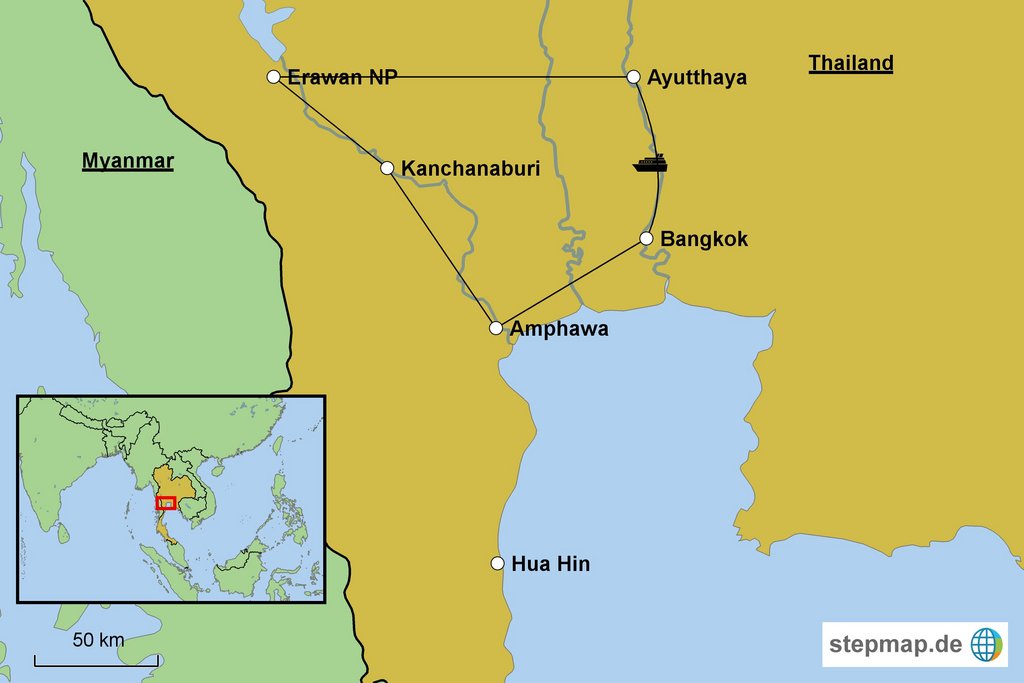 Start der Reise: täglich Stationen der Route: Bangkok Ampawa Kanchanaburi Erawan Nationalpark Ayutthaya Bangkok