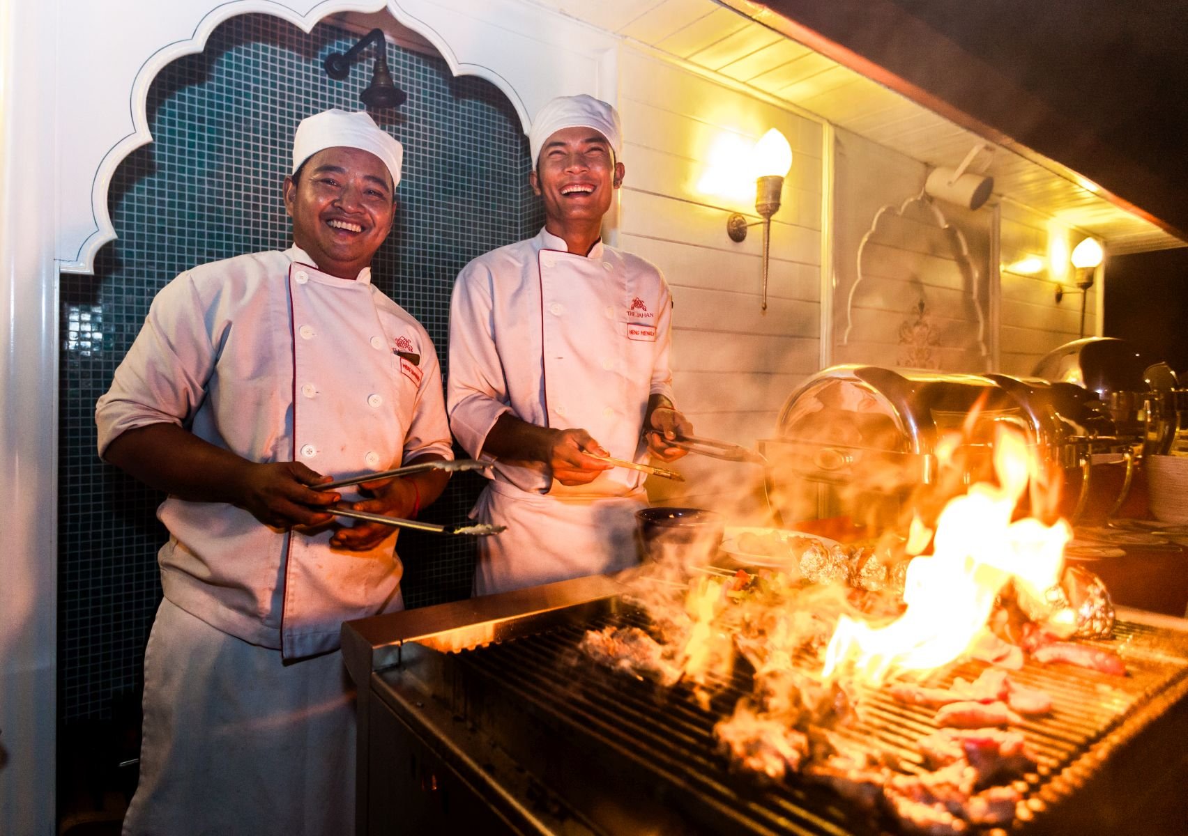 Zurück an Bord ist Zeit für Erholung und zur Vorbereitung auf das Barbecue-Dinner am Sonnendeck. Das Abendessen wird von einer beeindruckenden traditionellen Apsara-Tanzvorführung begleitet.