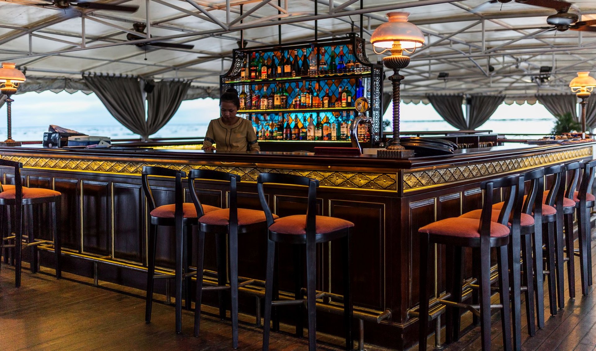 Wenn die Sonne untergeht genießen wir am Flussufer Cocktails, bevor wir zum Abendessen an Bord der Jahan oder Jayavarman zurückkehren.