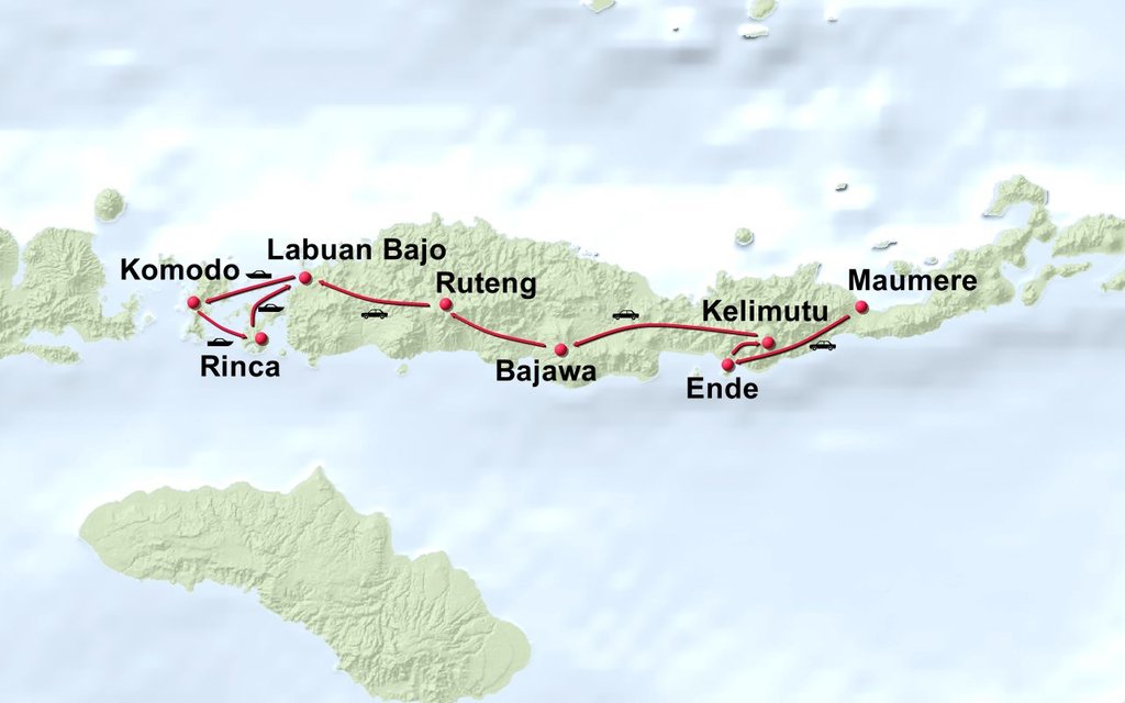 Stationen der Route: Ende Moni Ranggase Nggela Koka Beach Kelimutu Bajawa Penggajawa Beach Bloji Warusoba Bena Ranamese See Ruteng Cancar Lembors Labuan Bajo Komodo Pink Beach Bidadari Island Labuan Bajo