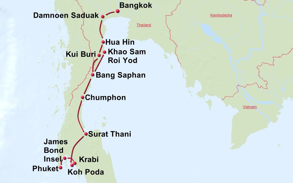 Stationen der Route: Bangkok Ratchaburi Hua Hin Kui Buri Nationalpark Bang Sapan Chumphon Surat Thani Koh Poda Krabi James Bond Island Phuket