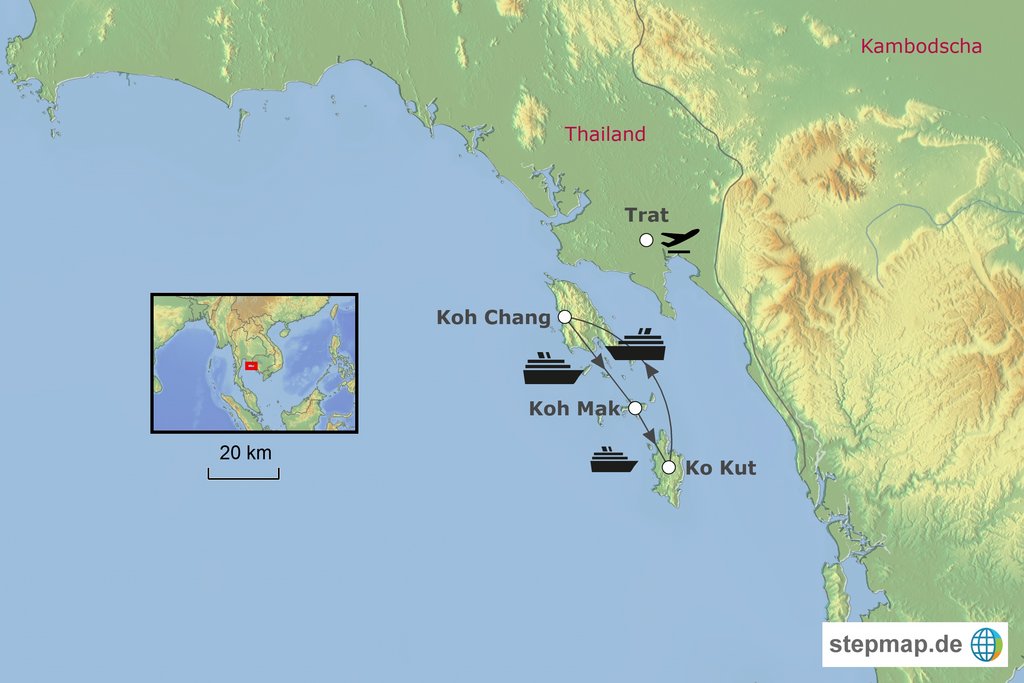 Stationen der Route: Koh Chang Koh Kham Koh Mak Koh Rang Koh Kood Koh Chang