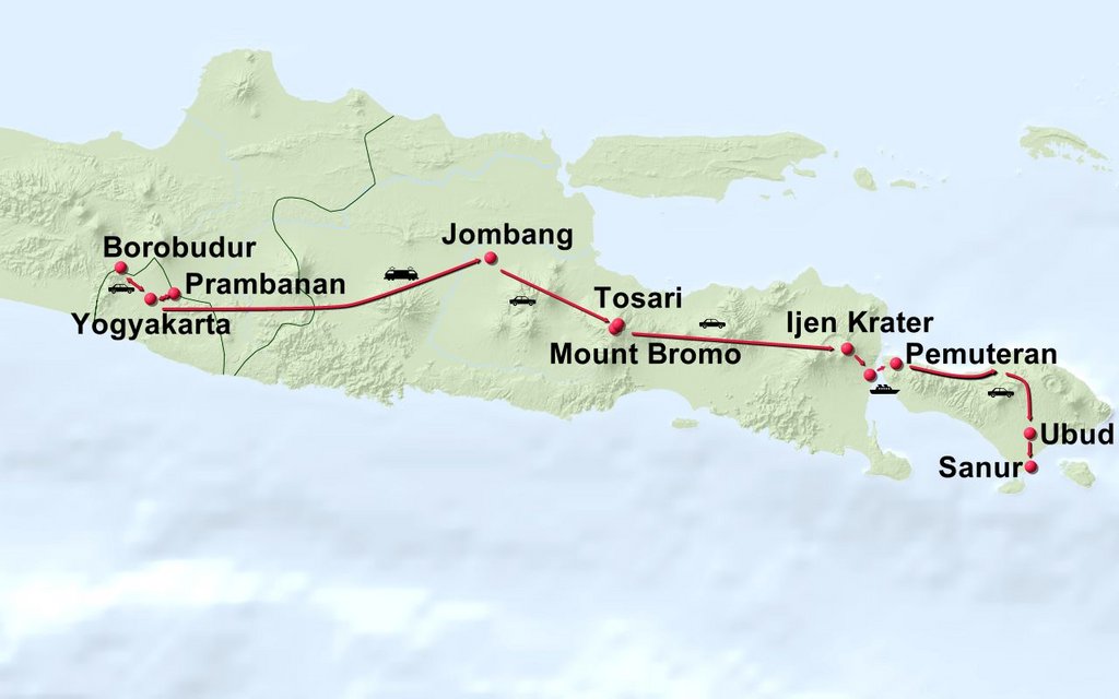 Stationen der Reise: Yogyakarta Prambanan Borobudur Jombang/Mojokerto Tosari Mount Bromo Ijen Pemuteran Menjangan Ubud Südbali