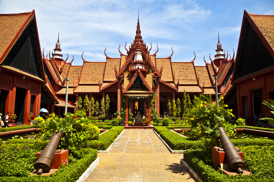 Die nächste Station ist der Königspalast, eines der prächtigsten architektonischen Bauwerke von Phnom Penh. Der in Gold schimmernde Königspalast ist ein spektakuläres Gebäude mit unglaublichen Schätzen. Die prächtige Smaragd-Buddha-Statue aus dem 17. Jahrhundert ist aus Jade gefertigt, der 90 Kilogramm schwere Maitreya-Buddha aus massivem Gold und mehr als 9000 Diamanten. Sie staunen über Stufen aus italienischem Marmor und Bodenfliesen der Pagode aus 500 massiven Silberblöcken. Anschließend geht es weiter zum Nationalmuseum, einem außergewöhnlichen Beispiel traditioneller Architektur, das ausschließlich der Bewahrung und Ausstellung von Khmer-Kunst und -Skulpturen gewidmet ist.