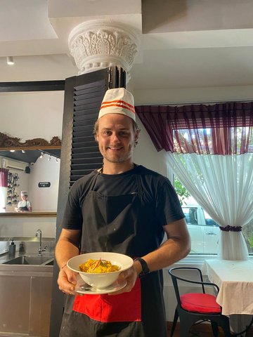 Zunächst geht es auf den lokalen Markt, wo Sie das bunte Treiben miterleben. Es gibt genügend Möglichkeiten für Fotos, Sie lernen die lokale Früchte, Gemüse und Kräuter kennen und besorgen sich die frischesten Zutaten für den heutigen Tag. In der Küche entdecken Sie schließlich die uralten Geheimnisse der Khmer-Küche. Mit der Unterstützung des Küchenchefs bereiten sie traditionelle Gerichte für das heutige Mittagessen zu. Die Rezepte dürfen Sie natürlich behalten, damit Sie das kambodschanische kulinarische Erlebnis bequem zu Hause nachkochen und Ihre Freunde und Familie beeindrucken können.