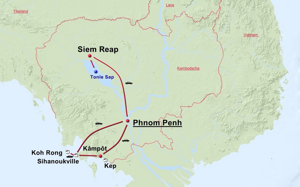 Stationen der Route: Siem Reap Phnom Penh Koh Rong Phnom Penh
