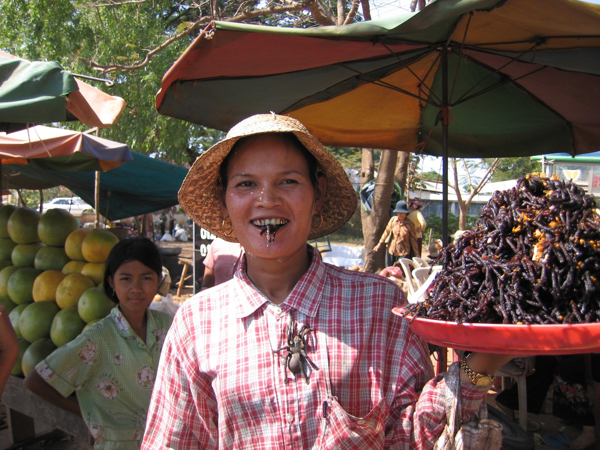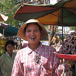 08:00 Uhr Abfahrt über Land nach Kompong Thom, vorbei an typisch kambodschanischen Dörfern. Sie halten in Skuon und Mutige verkosten die lokale kulinarische Spezialität, die frittierte Spinne.