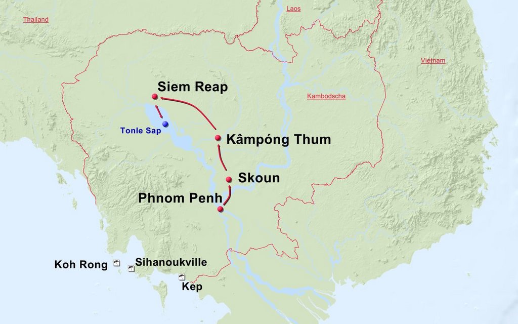 Stationen der Route: Phnom Penh traditionelle Dörfer Skuon Sambor Prei Kuk Siem Reap Tempelanlagen von Angkor Tonle Sap See Siem Reap