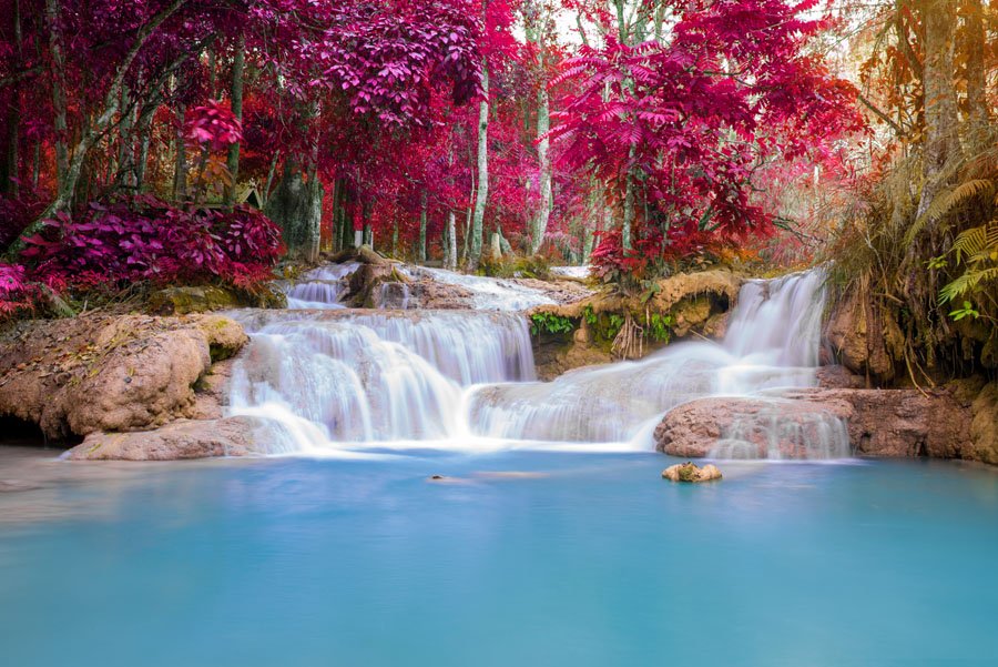 Am Nachmittag fahren Sie zu den faszinierenden Kuang Si Wasserfällen. Vergessen Sie nicht ihren Fotoapparat - türkisblaue Becken mit klarem Wasser, das in Kaskaden über die Felsen stürzt und üppige grüne Vegetation werden auch Sie verzaubern. Die Wasserfälle sind ein beliebtes Ausflugsziel zum Picknicken und Schwimmen. Badesachen mitnehmen für eine Erfrischung in einem der natürlichen türkisen Wasserpools! Wandern Sie die Fälle entlang nach oben um eine traumhafte Aussicht über das Tal und die Fälle zu genießen. Entlang von Reisterrassen fahren Sie zurück nach Luang Prabang und halten unterwegs noch in einem der traditionellen Dörfern.