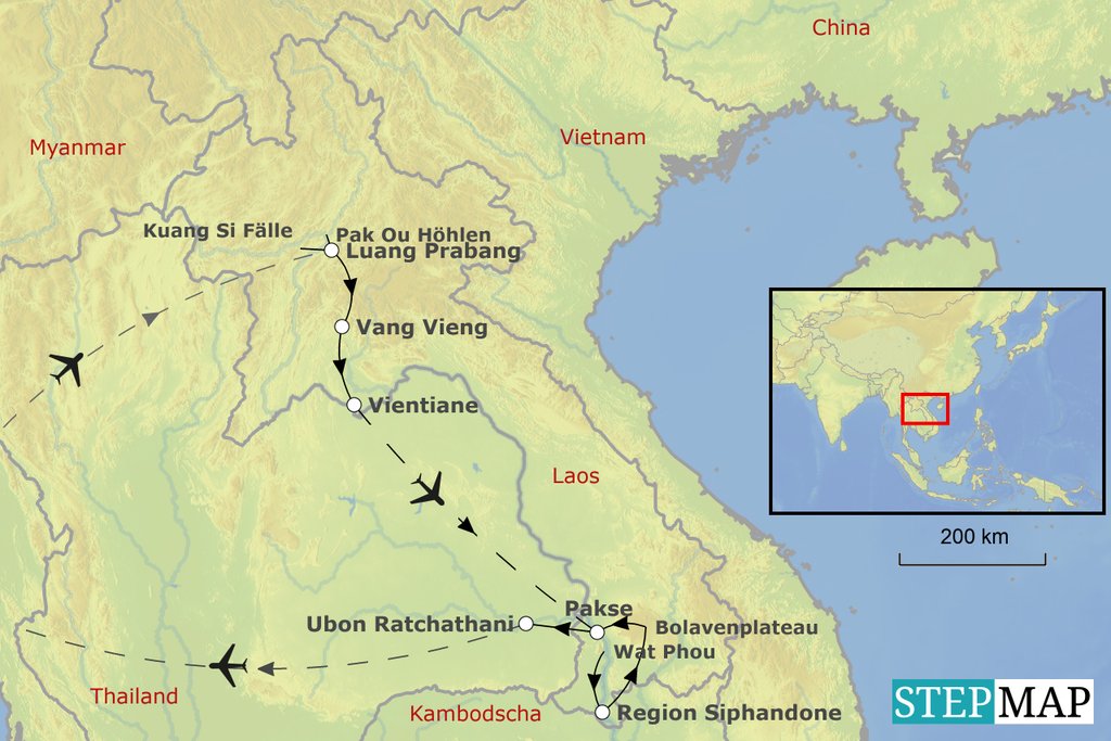 Stationen der Route: Luang Prabang Pak Ou Höhlen Kuang Si Wasserfälle traditionelle Dörfer um Luang Prabang Vang Vieng Vientiane Pakse Champasak Mekong Inseln Pakse