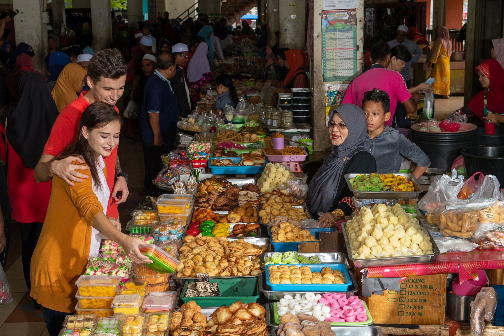 Beim Besuch des farbenfrohen Marktes tauchen wir komplett ein in die lokale Atmosphäre. Die meisten Markthändler hier sind Frauen, was ein einzigartiger Aspekt der Kultur des Bundesstaates Kelantan ist. Es werden zahlreiche lokale Produkte wie Obst und Gemüse aber auch Batikkleidung oder Stoffe mit exotischen Mustern angeboten. Kota Bahru ist außerdem berühmt für Silberwaren und Schmuck, Flugdrrachen, Kreisel und die großartige Songket-Weberei. Wir können zusehen wie brauner Zucker abgezapft und verarbeitet wird. Denn die Stadt bietet eine große Auswahl an süßen Backwaren und Köstlichkeiten, die typisch für diesen Teil des Landes sind.