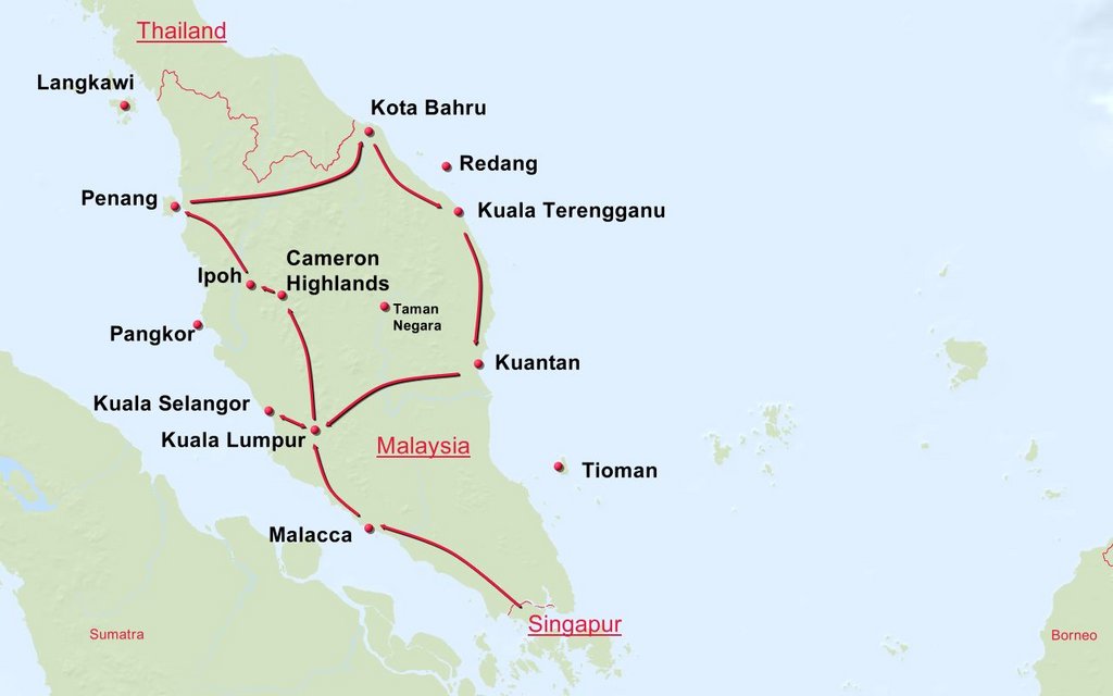 Stationen der Route: Singapur Johor Bahru Malacca Kuala Lumpur Kuala Selangor Cameron Highlands Penang Kota Bahru Kuala Terengganu Kuantan/Cherating Kuala Lumpur
