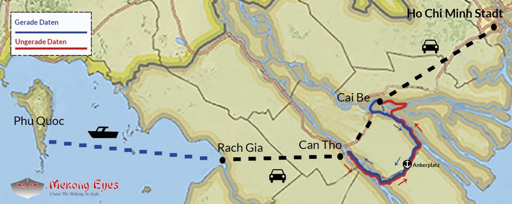 Stationen der Route: Ho Chi Minh City My Tho Cai Be Vinh Long Tra On Can Tho Rach Gia Phu Quoc