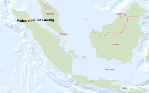 Die Ankunft am Flughafen Medan Kuala Namu sollte vor 14:00 Uhr erfolgen. Dort werden Sie dann erwartet und die Fahrt führt in nordwestlicher Richtung zum Orang-Utan-Zentrum in Bohorok. (inkl. Stops etwa 5 Stunden)