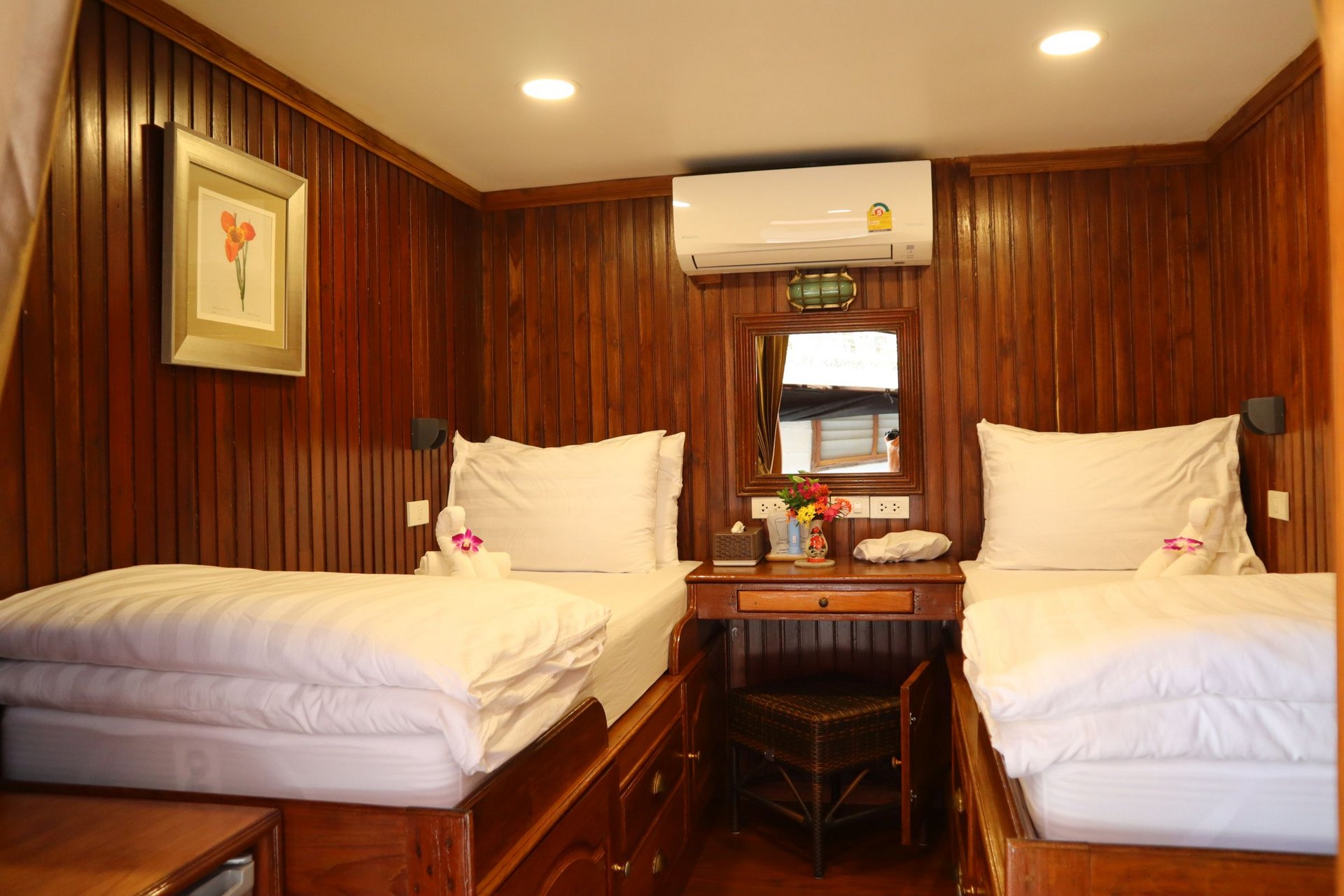 Das Schiff bietet Platz für maximal 20 Passagiere an Bord in Zweibettkabinen. Diese sind ausgestattet mit Dusche/WC, Klimaanlage und viel Holz. Damit erkunden Sie ganz entspannt die Region Kanchanburi 150 km westlich von Bangkok. Die alljährlich Zeit im Trockendock im Mai und Juni wird genutzt für Erneuerungen und Instandhaltung. Täglich sind Ausflüge zu den Sehenswürdigkeiten entlang des Flusses inkludiert - Tempel, historische Denkmäler, Khmer Ruinen, Wasserfälle, die Brücke am River Kwai und mehr. Das Schiff lehnt sich im Stil an die klassischen Kolonialschiffe der Irrawaddy Flotilla an. Das obere Deck ist frei zugänglich hier befinden sich die Bar und Sitzbereiche. Genaues Besichtigungsprogramm vorbehaltlich Änderung auf Grund von Wasserstand und Wetter. Technische Daten: Länge 36m | Breite 7,6m | Tiefgang 90cm | Auftrieb 3,5m (weitere Informationen gerne auf Anfrage), keine Rollstühle an Bord möglich