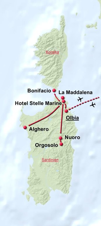 Gruppentermin 17.Mai - 24.Mai 2025 | Reisebegleitung Joe Himmelbauer ab/bis Wien | inkl. Flug und Halbpension | 1x zusätzliches Mittgessen, 1x Focacciaimbiss | 3 Ausflüge auf Sardinien, 1 Ganztagesausflug nach Korsika