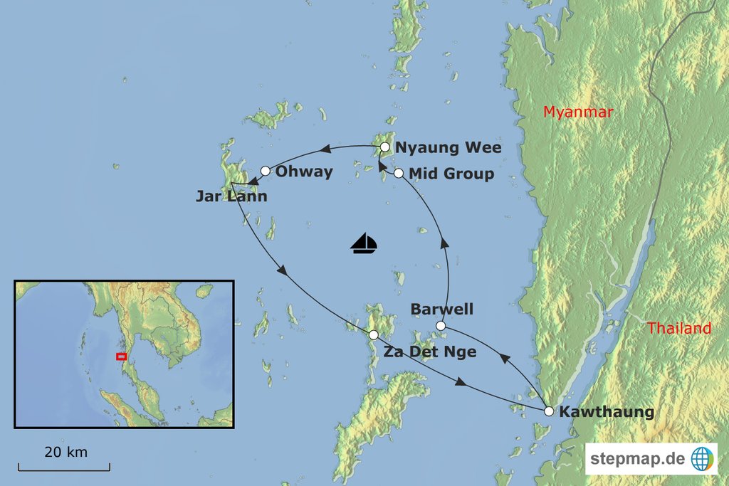 Stationen der Route: Kawthaung Barwell Island Island Nr 115 Mid Group Island Nyaung Wee Island Ohway Island Za Det Nge Island Kawthaung