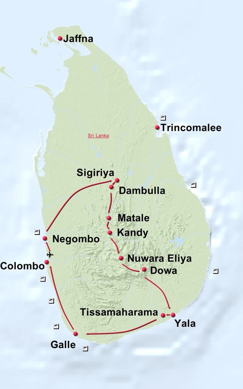 Stationen der Reise: Negombo Sigiriya Dambulla Kandy Teeplantage Nuwara Eliya Rawana Wasserfall Yala Nationalpark Tissamaharama Galle