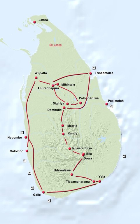 Stationen der Reise: Colombo Wilpattu Nationalpark Anuradhapura Mihintale Sigirya Polonnaruwa Trincomalee Dambulla Kandy Nuwara Eliya Ella Udawalawe Yala Nationalpark Galle Negombo