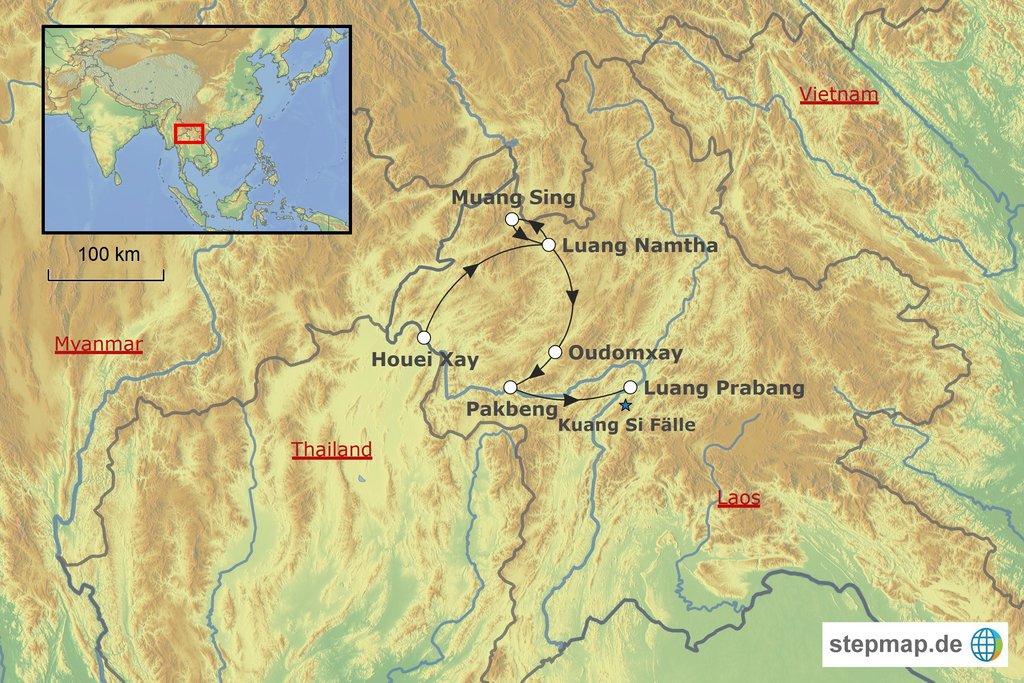 Stationen der Route: Houei Xay Luang Nam Tha Muang Sing Oudomxay Pakbeng Luang Prabang