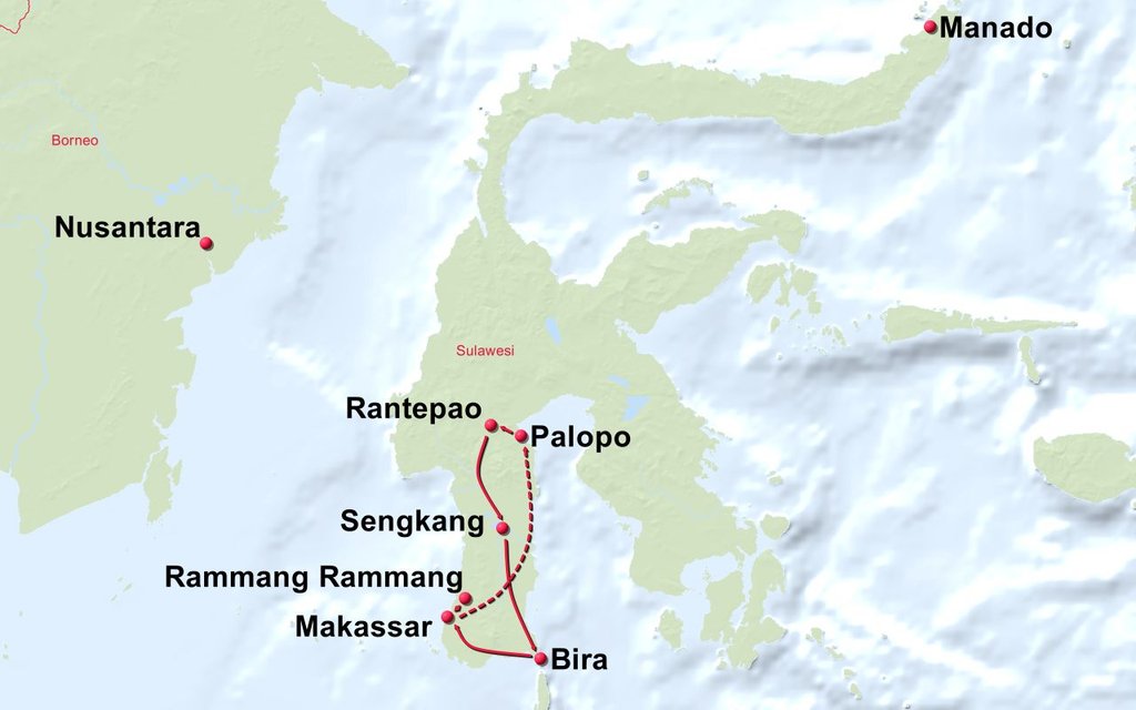 Stationen der Route: Makassar Leang Leang Rammang Rammang Torajaland Sengkang Bira Makassar