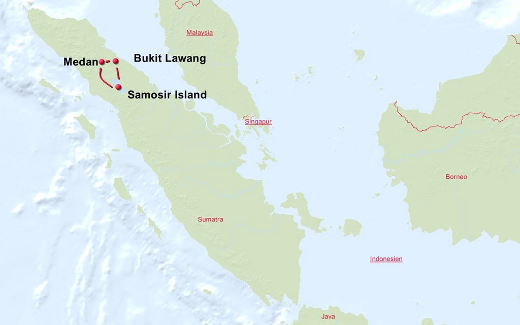 Nach dem Frühstück brechen Sie auf ins Abenteuer! Geplant ist eine etwa 3-stündige Dschungelwanderung. Dabei sollen Sie halbwilde oder wilde Orang-Utans beobachten können. Das Trekkingtempo wird an Ihre persönliche Ausdauer angepasst. Trotzdem ist körperliche Fitness und gutes (großprofiliges) Schuhwerk gefragt! Steile Hänge und dichte Vegetation entführen Sie in den aufregenden Regenwald von Sumatra. Hier haben Sie die Möglichkeit, verschiedene Arten einheimischer Flora und Fauna zu entdecken. Wenn Sie Glück haben, können Sie Orang-Utans, Languren, Makaken, Gibbons, Siamangs und eine reiche Vogelwelt beobachten. Anschließend kehren Sie nach Medan zurück (3 Std Fahrzeit). Das wohlverdiente Abendessen nehmen Sie in einem lokalen Restaurant ein. Übernachtung in Medan.