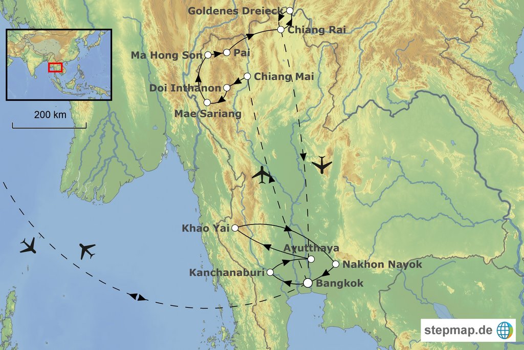 Stationen der Route: Wien Bangkok Nakhon Pathom Kanchanaburi Suphan Buri Ang Thong Ayuttaya Khao Yai Nakhon Nayok Bangkok Chaing Mai Doi Inthanon Mae Sariang Mae Hong Son Pai Thaton Chaing Rai Goldenes Dreieck Mae Sai Chaing Rai Bangkok Wien