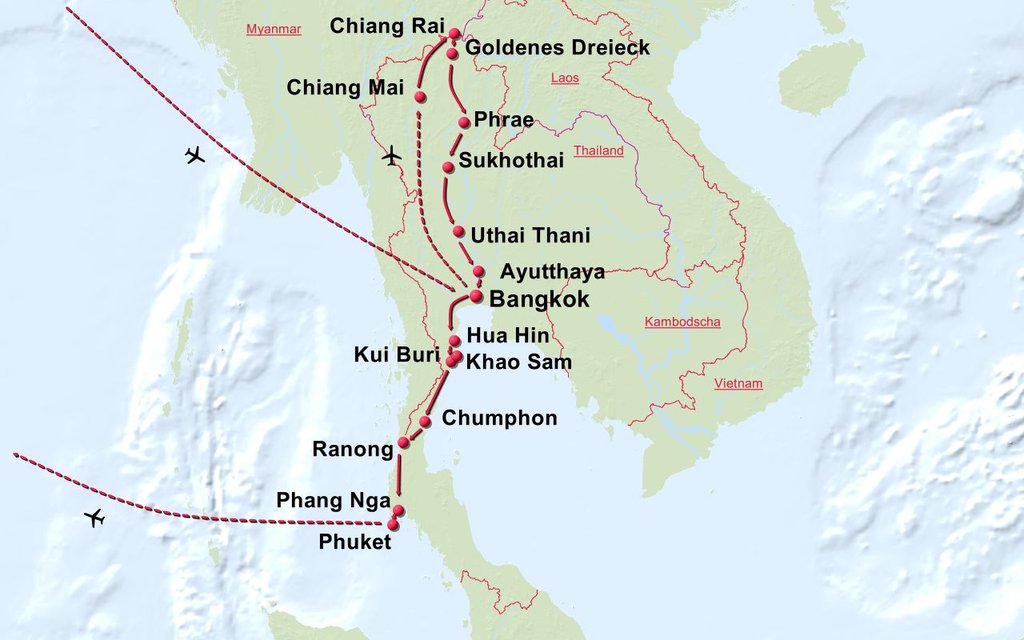 Stationen der Route: Chiang Mai Chiang Rai Goldenes Dreieck Phrae Sukhothai Phitsanuloke Uthai Thani Ayutthaya Bangkok Petchburi Hua Hin Sam Roi Yod Kui Buri Chumphorn Ranong Si Phnang Nga Nationalpark Phang Nga Bay Phuket