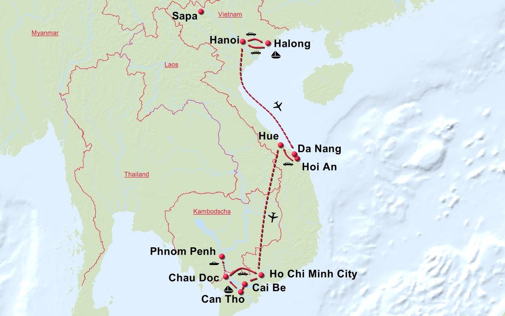 Stationen der Route: Stationen der Route: Hanoi Halongbucht Hanoi Danang Hoi An Hue Ho Chi Minh City Cai Be Can To Chau Doc Ho Chi Minh City oder Phnom Penh