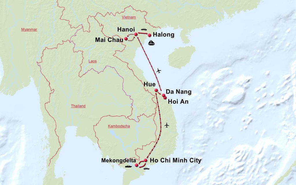 Stationen der Route: Ho Chi Minh City Mekong Delta Hue Hoi An Da Nang Hanoi Halongbucht Hanoi