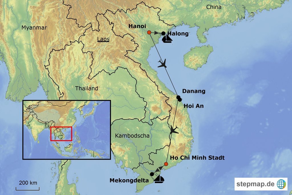 Stationen der Route: Hanoi Halong Hanoi Danang Hoi An Hue Ho Chi Minh City Cu Chi Tunnel Mekongdelta Ho Chi Minh City