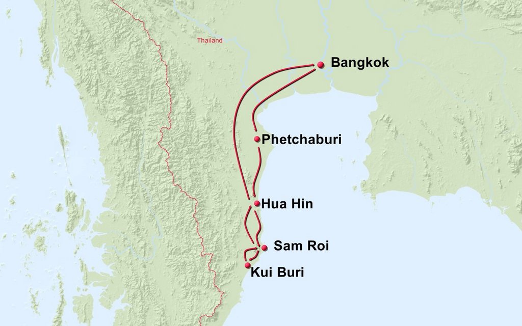 Stationen der Route: Bangkok Kuiburi Nationalpark Sam Roi Nationalpark Bangkok (alternativ Hua Hin)