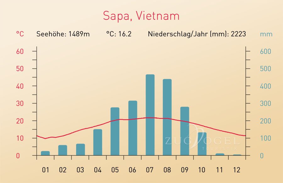 Die Gegend rund um Sapa (oder Sa Pa) ist besonders in den Frühlingsmonaten März bis Mai und im Herbst von September bis November. Von Oktober bis März kann es schon einmal vorkommen, dass es in den hohen Regionen zu Schneefällen kommt. Im Sommer herrschen zwar angenehme höhere Temperaturen, aber es fällt auch der meiste Niederschlag.